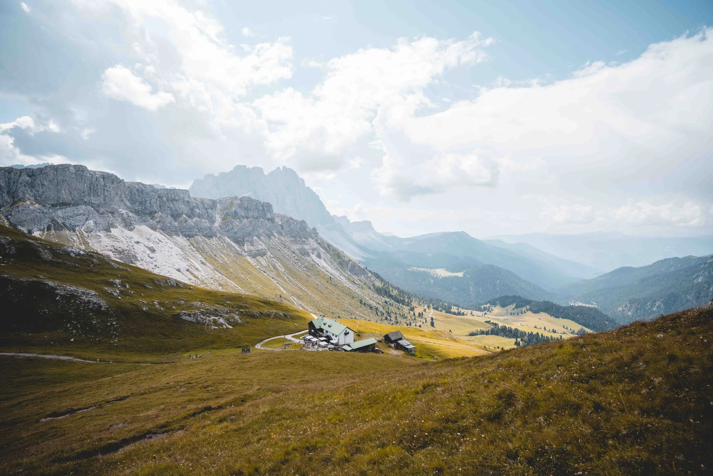 Das Hotel Gsoihof. Im Hintergrund die Geisler-Spitzen.
