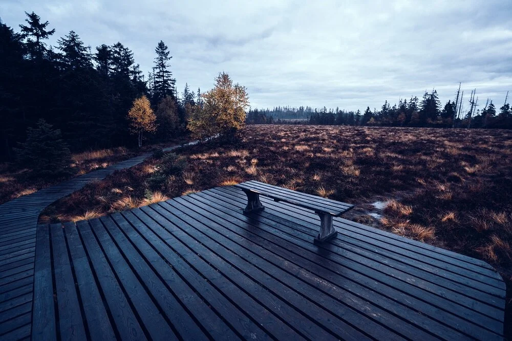 An diesem Morgen parkte ich am Schullandheim auf Torfhaus und lief die kurze Strecke (ca. 800 Meter) bis zum Einstieg ins Moor. Da dieses Gebiet ein extrem empfindlicher Lebensraum ist führt nur ein kurzer Steg am Rand des Moores entlang. Ich hatte auf einen goldenen Sonnenaufgang gehofft, wurde jedoch enttäuscht. Trotzdem gab es dann eine interessante morgendliche Lichtstimmung. Ich lief einige Male auf dem Bohlen Weg hin und her bis ich einen passenden Vordergrund fand: